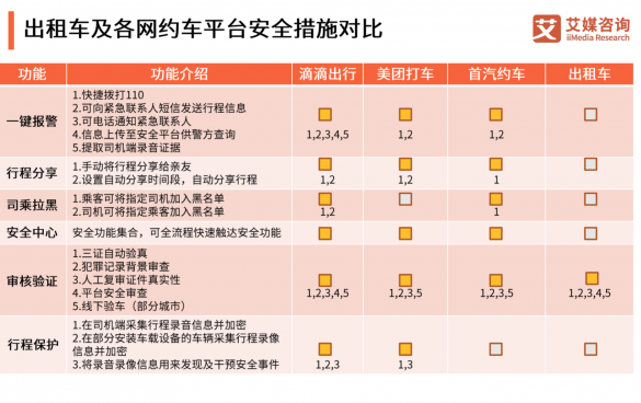 報告分析對比了出租車和各網約車平臺的安全措施,結果顯示,2018年行業整改期間,眾多網約車平臺已對安全措施進行了優化升級。其中,滴滴出行的安全措施最為全面,除了一鍵報警、行程分享、司機審核驗證(三證驗真、犯罪背景審查等)外,還上線了司乘黑名單、錄音錄像等功能,進一步減少車內沖突,保障司乘雙方安全。而相對來說,出租車除了審核驗證之外,在事中事后的安全抓手較少。