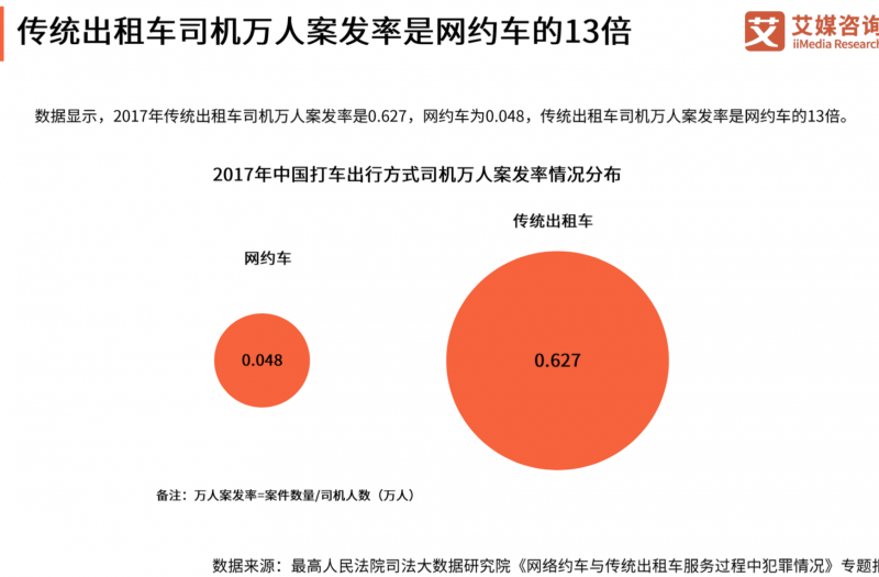 2018年最高法司法大數據研究院《網絡約車與傳統出租車服務過程中犯罪情況》專題報告指出,2017年全年,網絡約車司機在提供服務過程中實施犯罪的案件量不足20件,每萬人案發率為0.048,傳統出租車司機在服務過程中實施犯罪的案件數為170余件,萬人案發率為0.627。傳統出租車司機犯罪案件數量是網約車司機的9.7倍,萬人發案率是后者的13倍。