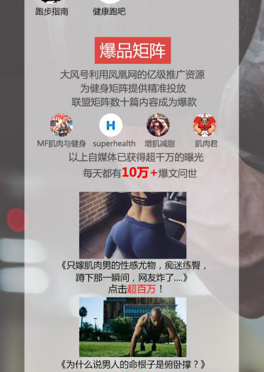 特別是春節過后,用戶的生活品質亟待提升,大風號順時而動,啟動“健身聯盟”,投入億級推廣資源,海納健身、健康自媒體,組成了一個專業、科學、易學習的健身自媒體矩陣!