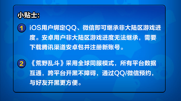在國服開啟預約前,日夜翹首以盼的玩家們都對國服《荒野亂斗》產生了不少疑問,包括:非大陸區游戲進度能不能繼承?國服游戲內容是否跟非大陸區游戲內容一致?是否全球同服?等等。對此,官方作出了權威解答:iOS用戶綁定QQ、微信即可繼承非大陸區游戲進度。安卓用戶非大陸區游戲進度無法繼承,需要下載騰訊渠道安卓包并注冊新賬號。