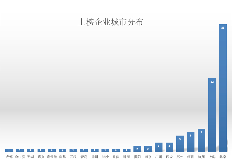 從城市分布來看,不出意外,北京以38家企業獨占鰲頭,這些企業集聚在云計算、大數據、人工智能、物聯網及互聯網等多行業。北京幾乎“命中”了所有行業,這意味著北京依然是當下產業生態最豐富的城市。