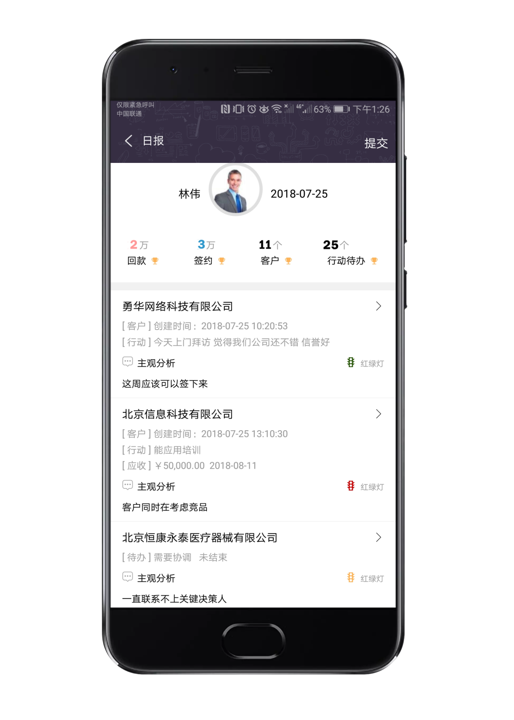 不是所有的日報都只是記流水賬:快目標APP“智能日報”令人耳目一新,它有5大特點:①自動匯總:當天工作自動匯總到日報,展示當日簽約、客戶、行動待辦等關鍵數據。②客戶歸納:按照客戶的行為歸納,幫助銷售自動分析梳理。③主客觀結合:客觀行為+主觀分析,以客戶為核心做分析。④跟單紅綠燈:綠燈順利,黃燈卡滯,紅燈危險,一眼看出難題客戶。⑤及時輔導:上級可以回復,可做客戶討論,加速組織智慧賦能。