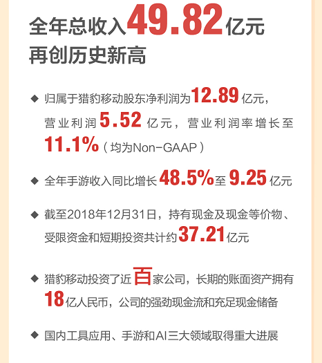 北京時間3月25日,獵豹移動(代碼:CMCM)發布了截至2018年12月31日的全年財報。根據財報顯示,獵豹移動2018年全年總營收49.82億元,Non-GAAP歸屬于獵豹移動股東凈利潤為12.89億元,Non-GAAP營業利潤為5.52億元,Non-GAAP營業利潤率增長至11.1%。獵豹移動董事長兼CEO傅盛在分析師電話會議里表示,2018年公司全年財務業績符合管理層預期,尤其是在國內工具應用、手游和AI領域取得了較大增長。