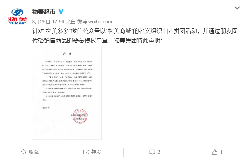 速途網(wǎng)3月27日消息(報(bào)道:李楠)昨日晚間,物美超市官方微博發(fā)布聲明,指出“物美多多”公眾號上“物美商城”系山寨拼團(tuán)活動,目前該公眾號已關(guān)閉。