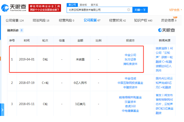 速途網4月1日消息(報道:吳佳馨)天眼查數據顯示,4月1日,北京云知聲信息技術有限公司完成D輪融資,投資方為中金公司、東方證券及清和泉資本。云知聲成立于2012年6月,專注于物聯網人工智能服務,擁有完全自主知識產權。天眼查數據顯示,云知聲C輪系列融資總金額已達13億元人民幣。