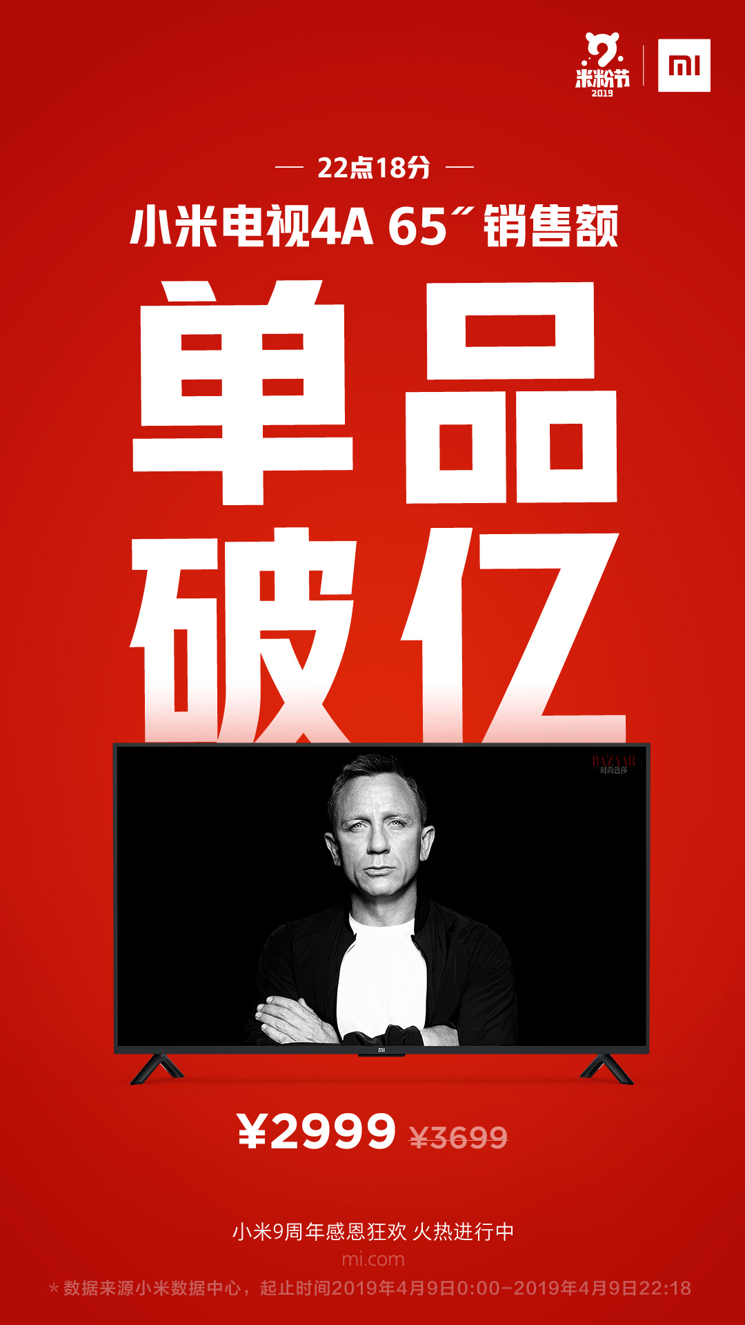 小米一年一度的“2019米粉節”正在如火如荼的進行中,截止22點18分,小米電視4A 65英寸銷售額突破1億元,掀起一場徹徹底底的大屏電視普及風暴,米粉節還剩下不到2個小時,這款熱門65英寸大屏電視米粉節價格僅為2999元,自用或買給父母都相當合適,不可錯過!