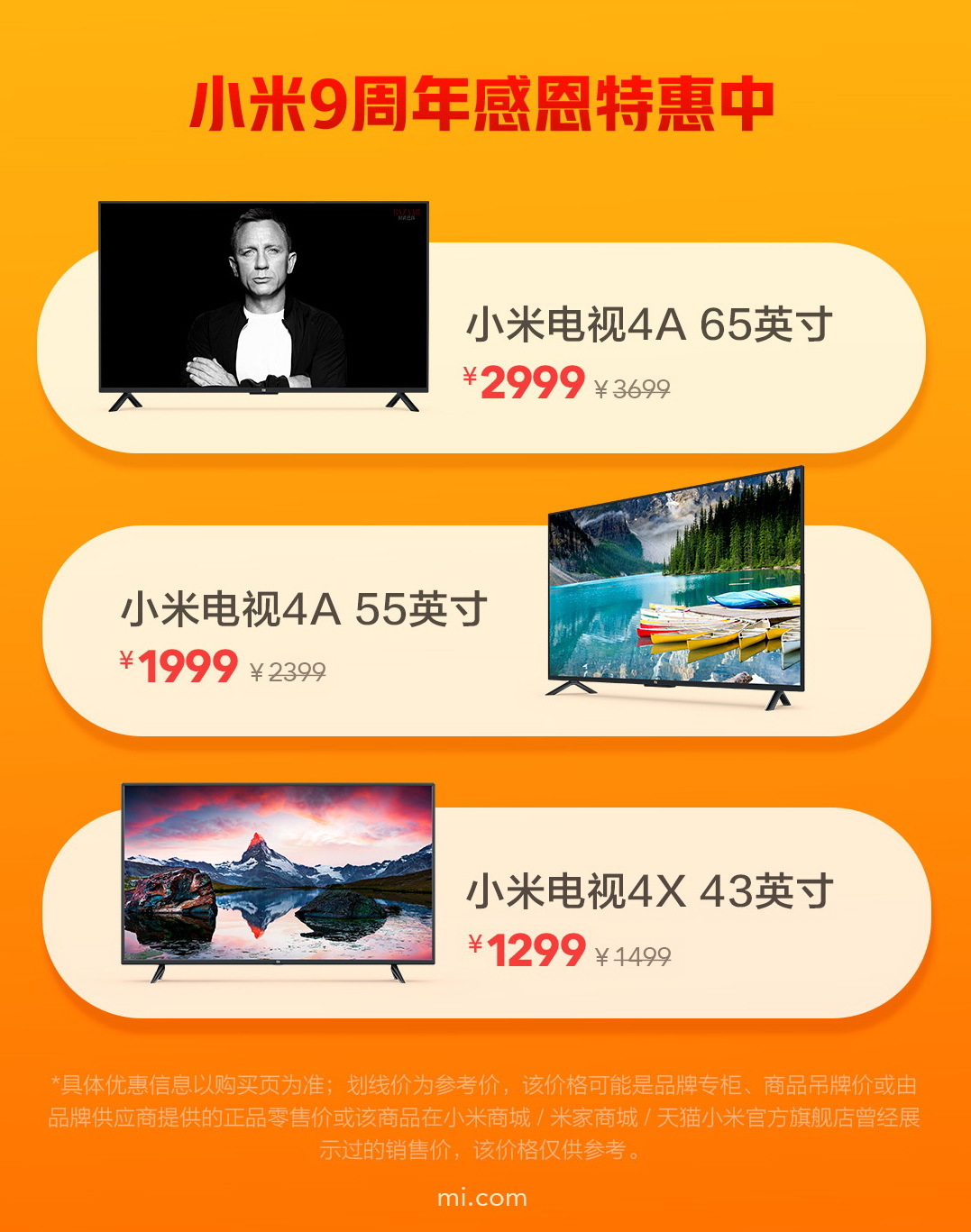 根據企鵝智庫2019中國網民購買力報告顯示,在挑選智能電視品牌中,小米是四成以上網民的選擇,占比41.8%,位居第一。目前米粉節促銷活動中,小米電視4A 65英寸售價2999元,小米電視4X55英寸售價1999元,小米電視4A 49英寸僅售1499元等等,力度空前,千萬不要錯過哦。