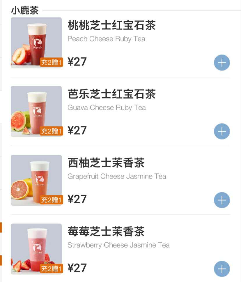 此外,瑞幸咖啡還于今日在北京、廣州上線茶飲“小鹿茶”,目前可供選擇的口味包括芭樂芝士紅寶石茶、莓莓芝士茉香茶、桃桃芝士紅寶石茶以及西柚芝士茉香茶,價格為27元,享受買二送一優惠 。