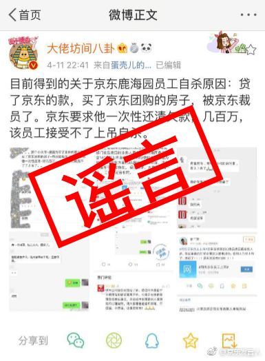 京東發言人同時稱,微博賬號“大佬坊間八卦”多次發布針對京東和京東員工的不實謠言,近日又在微博上發布消費京東離世員工的不實謠言,京東表示將馬上采取法律行動維護公司和員工的尊嚴。