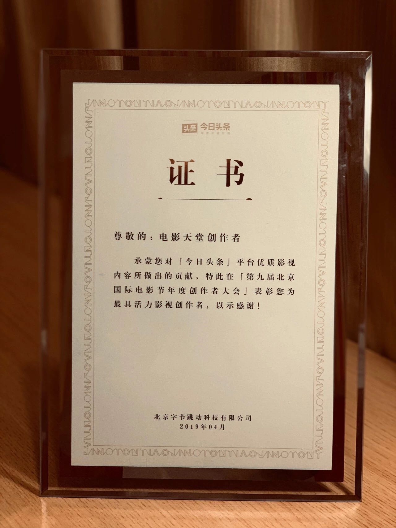 “電影天堂”榮獲今日頭條“最具活力影視創作者”