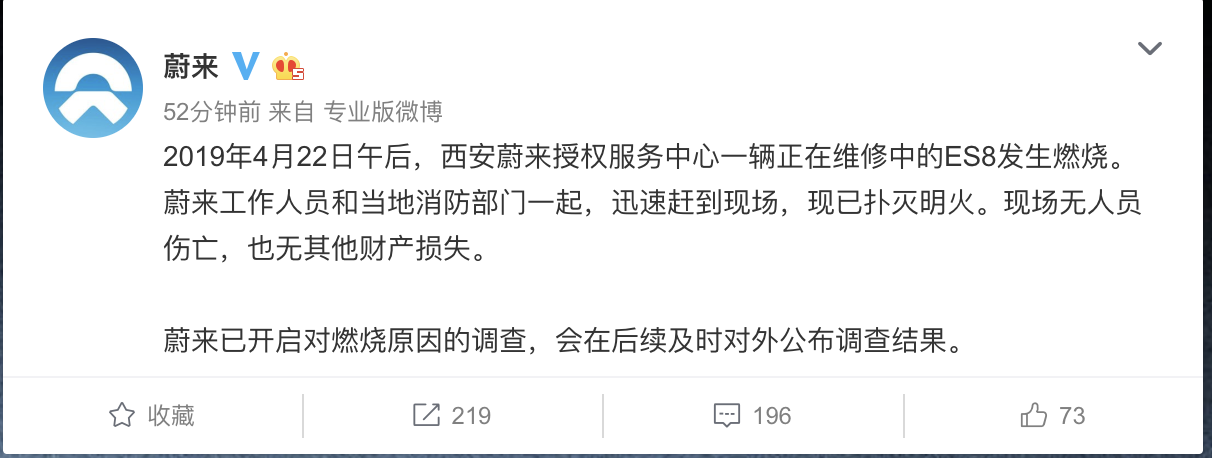 截止目前,蔚來官方已在社交媒體公布燃燒情況,同時表示已經(jīng)開啟對燃燒原因的調(diào)查,會在后續(xù)及時對外公布調(diào)查結(jié)果。 ????