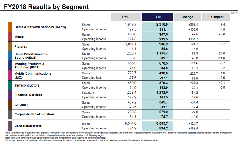 速途網4月26日消息(報道:喬志斌)?今日,索尼公布了2018財年(2018年4月1日-2019年3月31日)整體業績數字。本財年索尼公司實現銷售收入86,657億日元,較上一財年增加了1,217億日元(1%)。其中,游戲及網絡服務業務(G&NS)的銷售額大幅增加,但受移動通訊業務(MC)銷售額較大下降影響,整體上有所抵消。