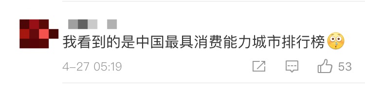 還有網(wǎng)友表示,這個榜單其實是中國最具消費能力城市排行榜。