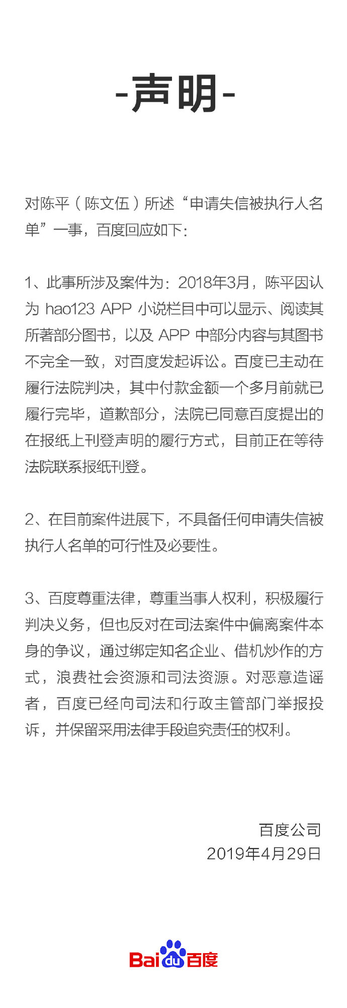 速途網4月29日消息(報道:吳佳馨)針對此前作家陳平在微博稱,因百度未在法定期限內履行法院作出的公開道歉、賠償經濟損失等判決,已申請將百度公司實際控制人李彥宏、馬東敏等納入失信人名單和限制高消費一事,百度對此做出回應,表示:反對借機炒作,對惡意造謠者,已舉報。