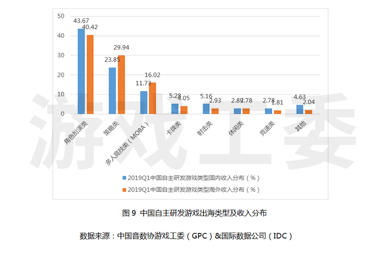 值得注意的是,2019年第一季度中國自主研發游戲海外總收入為30億美元,占據企業收入的30.9%,成為中國游戲企業重要的收入來源。出海游戲中,三類游戲較受歡迎,分別為角色扮演類、策略類和多人競技類(MOBA)游戲;這三類游戲的收入合計占據海外總收入的86.3%。
