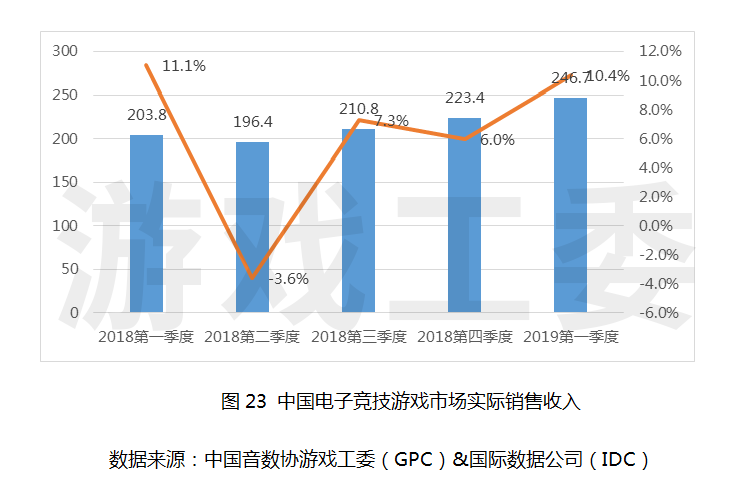2019年第一季度,中國電子競技游戲市場實際銷售收入246.7億元, 相比于2018年第四季度實際銷售收入增長23.3億元,環比增長10.4%,同比增長21.1%。中國電子競技用戶規模為4.4億人,環比增長1.8%,同比增長12.8%。