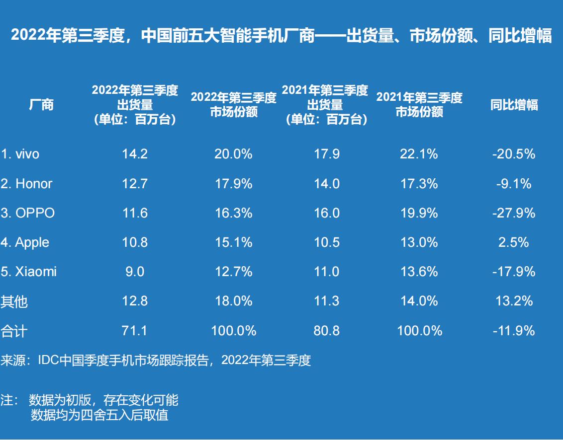 同時,IDC還指出2022年第三季度中國智能手機出貨量依舊出現了同比下滑,總出貨量為7110萬部,下降11.9%,但跌幅相較于前幾個季度有所收窄。其中,vivo在第三季度以1420萬部的出貨量位列第一,榮耀、OPPO、蘋果、小米分別以1270萬部、1160萬部、1080萬部、900萬部的出貨成績位列二至五名。