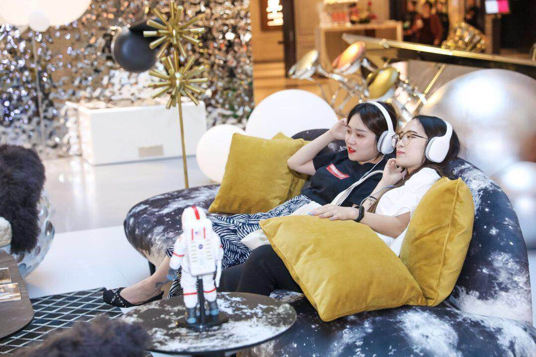 走進矛盾空間,發現yvvy的桌子椅子都離開了地面,分不清哪里是墻面地面。但無法讓人正常依偎的個性家具,并沒有阻擋現場觀眾圍著它們凹造型自拍的熱情。除了用眼睛去發現yvvy星球的與眾不同,還能去聽一聽、摸一摸、坐一坐,甚至躺一躺。用手去觸摸yvvy家具的別樣質感,去坐一坐那仿佛月球表面的沙發,再戴上耳機聆聽來自太空的聲音,觀眾在這一刻仿佛已經離開地球表面。