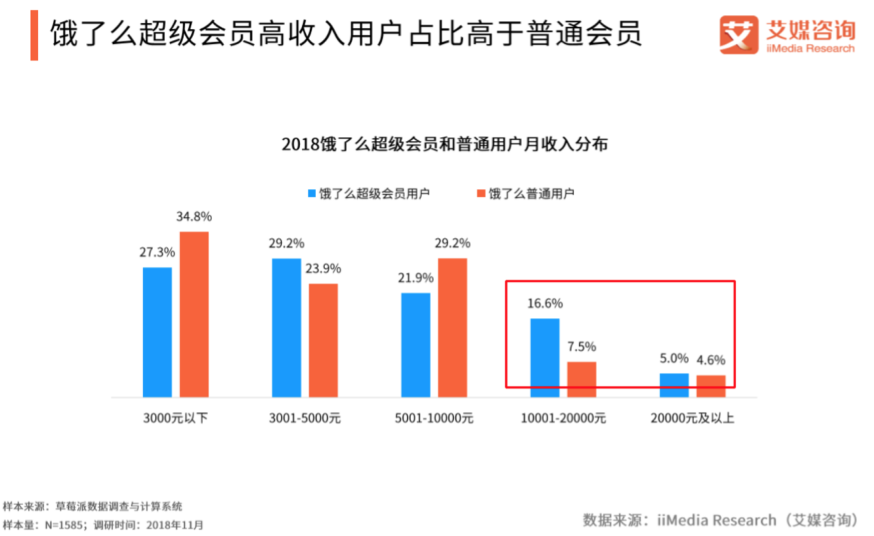 艾媒咨詢相關(guān)研究顯示,2018年中國在線外賣會員規(guī)模超過8000萬人,餓了么超級會員中,超過八成愿意為品質(zhì)外賣付費,月收入10000元以上的用戶占比達21.6%。該部分用戶往往具有較高消費能力,是品牌重點開發(fā)的對象。