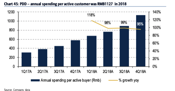 拼多多目前活躍買家數達4.19億,年平均消費額為1126.9元。美林認為,基于持續升級的匹配技術、領先的用戶參與度、更多樣化的產品、以及貫穿全年的高強度促銷活動,拼多多將推動用戶實現更頻繁購物,從而帶動GMV快速規模化增長。