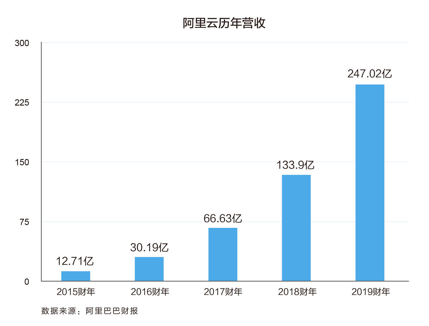 阿里巴巴在2015財年首次披露云計算營收,當年阿里云營收為12.71億元。到2019財年,阿里云營收為247億元,四年增長20倍。2019財年第四季度營收達77.26億元,飆升76%。這一增速超過亞馬遜AWS在相同規模下的增長速度。