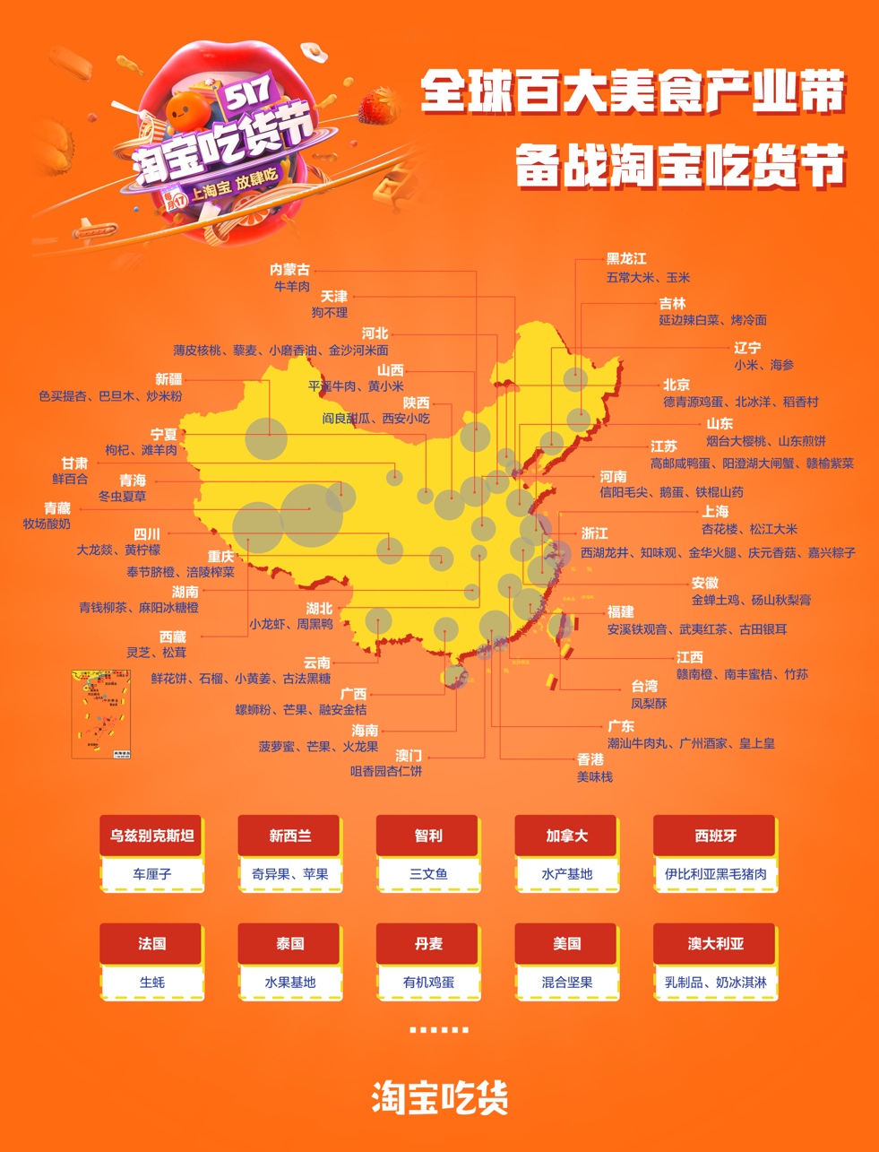 從國內到國外,烏茲別克斯坦的車厘子產區、新西蘭的奇異果產業帶、智利的三文魚產業帶、西班牙的伊比利亞黑毛豬肉產區、丹麥的有機雞蛋產區、泰國的水果基地等全球百大美食產業帶,都在為淘寶吃貨節忙碌著,將來自全球各地的生鮮美食通過淘寶直達吃貨手中。