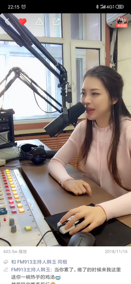 一段57秒的快手視頻中,韓玉展示了以往不被看見的電臺女主播工作場景。她溫柔的聲線引入一首老歌,獲得了高達603萬次播放。