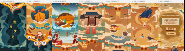 在開展《一刀傳世》端午節日活動的同時,三七互娛還制作了端午龍舟文化H5,以傳統插畫的美術風格向玩家乃至更廣泛的用戶傳播端午龍舟知識。說起龍舟,很多人只會知道“賽龍舟”的部分,其實在“賽龍舟”前后還有許多傳統習俗需要進行。而在這個H5中,三七互娛就向我們科普了“起龍船”、“采青”、“龍船景”、“藏龍”、“散龍”等習俗。