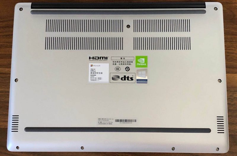 RedmiBook 14機身D面整體做工風格比較“豪放”,大面積的散熱格柵開孔保證了散熱效率,上下兩條橡膠腳墊則是為了保證機身在桌面上的防滑。