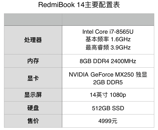 RedmiBook 14作為Redmi首款筆記本,顯示出Redmi品牌在生態鏈上的逐漸補齊。其中,頂配版不僅搭載了第八代英特爾酷睿i7處理器(i7-8565U)、英偉達MX250獨顯、8GB DDR4內存與512GB SSD等“豪華配置”,同時4999元的售價也讓i7筆記本進入了五千內的價位。而入門款也搭載了英特爾i5處理器(i5-8265U),3999元在同價位性能同樣豪華。