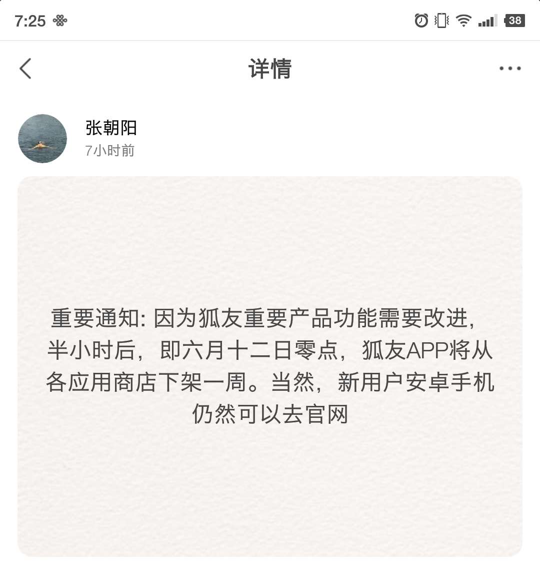 剛正式發布就下線?搜狐狐友宣布下線一周 李楠 ? 2019年6月12日 07:33 ? 元宇宙 速途網6月12日消息(報道:李楠)昨日夜間,搜狐CEO在狐友中發布重要通知。通知稱,因為狐友重要產品功能需要改進,狐友APP將從6月12日零點于各應用商店下架一周。新用戶安卓手機仍然可以去官網下載。 搜狐狐友 贊 (0) 李楠 0 生成海報 一文讀懂互聯網女皇報告:互聯網人口紅利持續衰減 上一篇 2019年6月12日 07:28 格力媒體采訪實錄:希望能帶動行業排查和改變 下一篇 2019年6月12日 07:34
