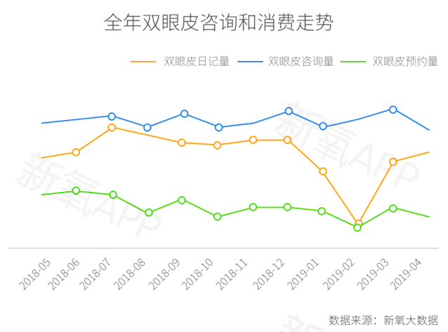 3月心動,6月預約,7月是手術施行高峰,9月釋放完6月的增量,這是新氧大數據顯示的過去一年典型雙眼皮手術用戶的消費軌跡。