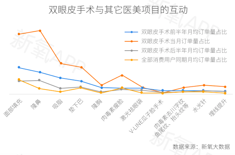 雙眼皮手術不單行,數據顯示,雙眼皮手術的第一大伴侶是開眼角,第二大伴侶是隆鼻,然后依次是面部填充、吸脂、墊下巴。因為開眼角常和雙眼皮手術打包購買,所以其數據包含于雙眼皮手術之中。