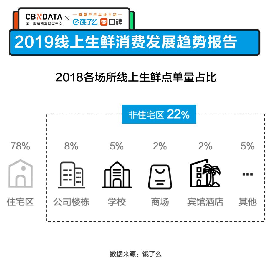 越來越多消費者通過餓了么實現“生鮮自由”。消費時間大大延長,《報告》顯示,2018年肉類訂單晚上17點到20點增速最快。消費者告別了菜場閉市的尷尬,即使在晚上也能購買到鮮美食材。消費場景亦大大拓寬,2018年餓了么非住宅區生鮮訂單占比達22%,消費者可以在公司樓宇、學校、賓館酒店等地下單。從送貨地址來看,僅2019一季度就有超10000個訂單送至公司,隨時隨地買菜成為可能。