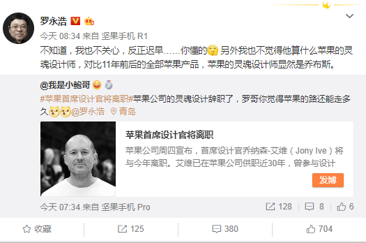其中又以錘子科技羅永浩為最。在艾維宣布離職后,羅永浩迅速發微博表示:“不知道,我也不關心,反正遲早……你懂的。另外我也不覺得他算什么蘋果的靈魂設計師,對比11年前后的全部蘋果產品,蘋果的靈魂設計師顯然是喬布斯。