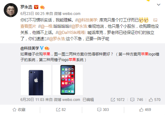 羅永浩的未竟話語,在他過去的微博中有所體現。6月19日,羅永浩宣布自己開通了推特賬號,并表示錘子科技海外業務即將展開。很是高興的老羅,在微博上連續回復了幾個網友,其中便有關于“收購”蘋果的言論。他表示如果能收購,iPhone和錘子兩個品牌和產品將單獨運作。
