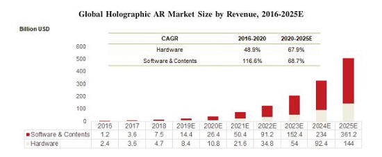 注: 硬件是指硬件制造商的收入,包括AR渲染設備,如AR眼鏡、AR頭盔等以及全息成像設備,例如全息投影儀、全息柜、全息廣告機等。軟件和內容是指提供增AR和全息內容、ARSDK或技術服務的參與者的收入。來源: Frost & Sullivan