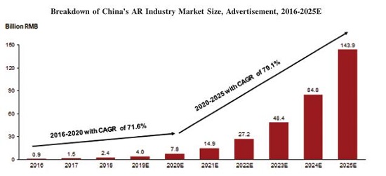 2016年中國全息AR廣告市場規模達到9億元,預計2016-2020年復合年增長率為71.8%,2020-2025年復合年增長率為78.9%,到2025年達到1439億元。2016年中國全息AR廣告市場規模達到9億元,預計2016-2020年復合年增長率為71.8%,2020-2025年復合年增長率為78.9%,到2025年達到1439億元。這一增長主要是由廣告業和新零售業的繁榮推動的。由于廣告商一直在追求最前沿的視覺效果來吸引顧客,廣告中的AR應用在不斷地向多元化發展。
