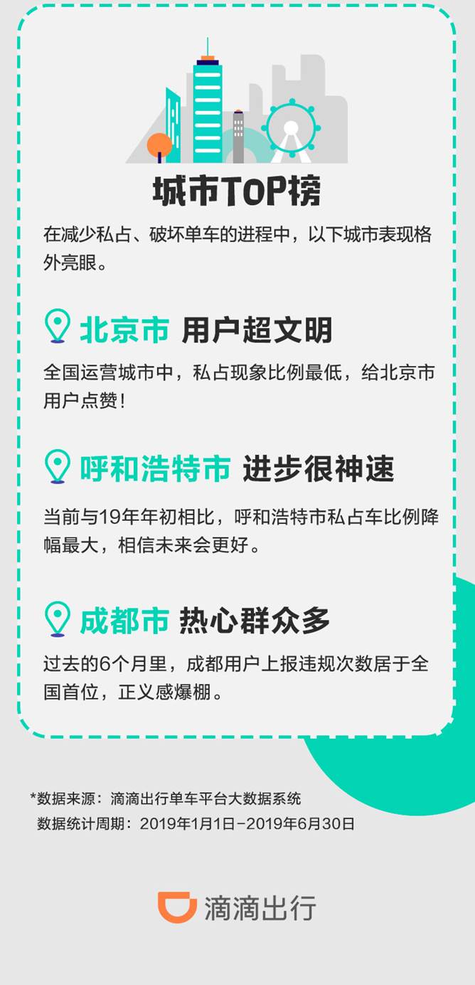 據了解,這次半年管控還產生了城市TOP榜。其中,北京“用戶超文明”在全國運營城市中私占現象比例最低;呼和浩特“進步最神速”,與年初相比,呼和浩特市私占車比例降幅最大;成都“熱心群眾多”,過去的6個月里,成都用戶上報違規次數居于全國首位。