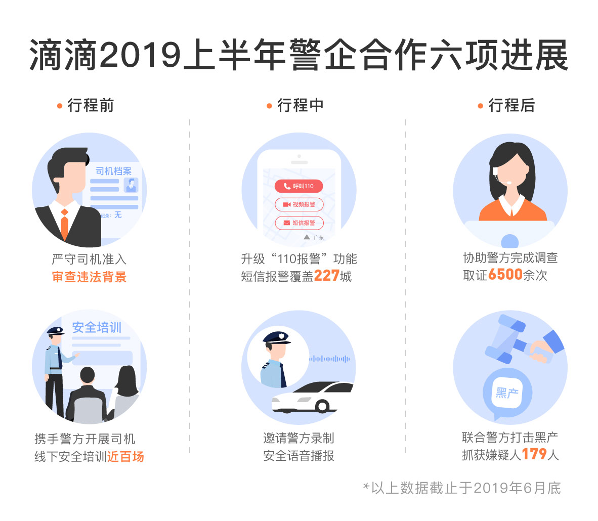 據速途網了解,為持續共創安全、文明出行環境,與社會各方攜手共同破解出行安全“難題”,2019年上半年,在主管部門的指導和幫助下,滴滴與全國警方在行程前、行程中、行程后,全面開展深入合作,共筑出行安全屏障。