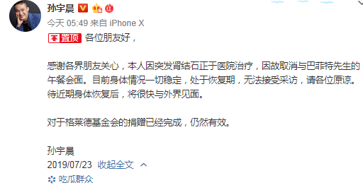 此前,孫宇晨在微博上表示,“本人因突發(fā)腎結(jié)石正于醫(yī)院治療,因故取消與巴菲特先生的午餐會面。目前身體情況一切穩(wěn)定,處于恢復(fù)期,無法接受采訪,請各位原諒。待近期身體恢復(fù)后,將很快與外界見面。對于格萊德基金會的捐贈已經(jīng)完成,仍然有效。”