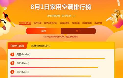 據蘇寧悟空榜大數據,截至8月1日凌晨1點,美的、海爾、格力獲蘇寧家用空調自營全渠道銷售額品牌前三,小Biu空調躋身空調熱銷榜TOP 4。
