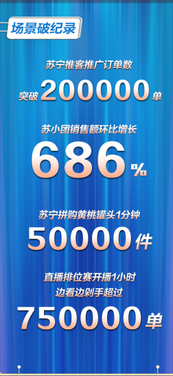 社交電商方面,得益于蘇寧社群矩陣、內容平臺,8月1日凌晨,蘇寧拼購黃桃罐頭一分鐘內售出50000罐。第一個小時內,蘇小團銷售額環比增長686%,蘇寧推客推廣訂單數突破20萬。蘇寧直播網紅帶貨排位賽,開播一小時,剁手訂單量超75萬。