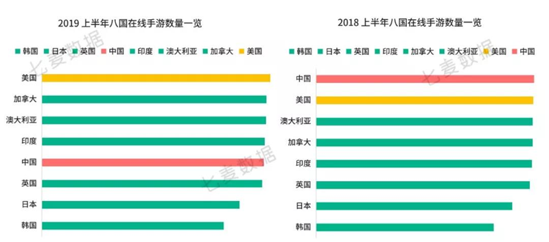 在2019上半年中、美、澳、加、印、英、日、韓八國App Store在線手游數(shù)量對比中,美國手游數(shù)量第一,中國手游數(shù)量排名第五,韓國數(shù)量最少。其中,美、加、澳、印、中、英在線手游數(shù)量差距不大。