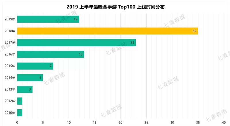 在此次Top100榜中,老游占比88%,2019年上線的僅有12款,遠少于2018年上線量。并且由于2018年吃雞、末日等題材火爆,2018年上線的手游的共35款手游中,「和平精英」、「明日之后」、「QQ炫舞」、「紅警OL」等爆款均位列榜單前20。