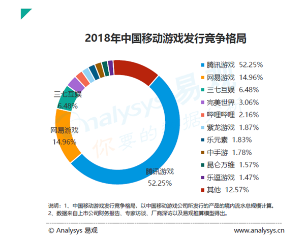 2018年三七互娛在移動游戲發行商排行中僅次于騰訊、網易,數據來源:易觀