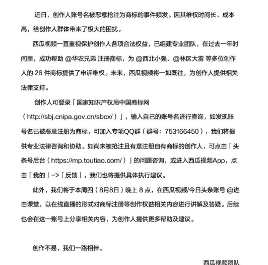 西瓜視頻同時表示,本周四晚上8點,將以在線直播的形式對商標注冊等創作權益相關內容進行講解以及答疑,后續也將分享相關內容,為創作人提供更多幫助及建議。