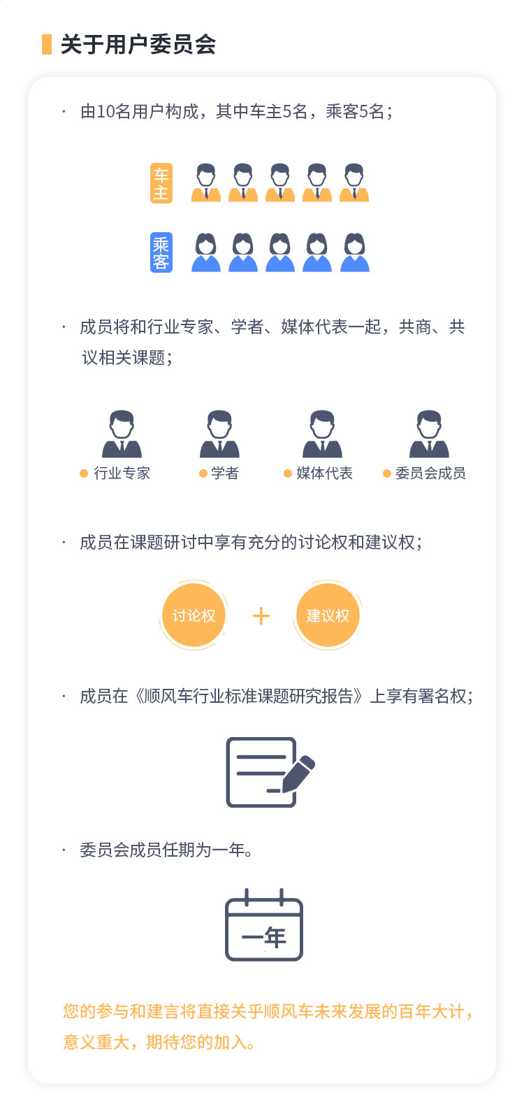 據(jù)速途網(wǎng)了解,首期用戶委員會成員將包含5名車主和5名乘客,他們將和行業(yè)專家,學(xué)者,媒體代表一起,共商共議順風(fēng)車行業(yè)標(biāo)準(zhǔn)相關(guān)課題,委員會成員在課題研討中將享有充分的討論權(quán)和建議權(quán),同時享有在《順風(fēng)車行業(yè)標(biāo)準(zhǔn)課題研究報告》上的署名權(quán),每位成員任期一年。