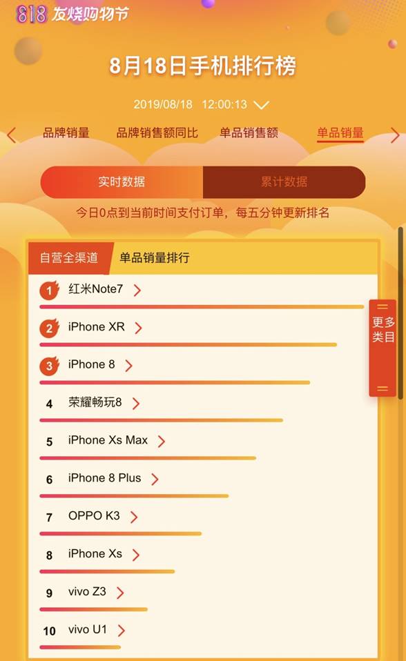 蘇寧818期間,蘋果、華為等多款手機降價,“以舊換新”加持,消費者的購買熱情被激發。截至8月18日12點,紅米Note7奪單品銷量第一,iPhone XR、iPhone 8緊追其后。小米、榮耀系列產品表現搶眼,品牌銷量額進入前三。