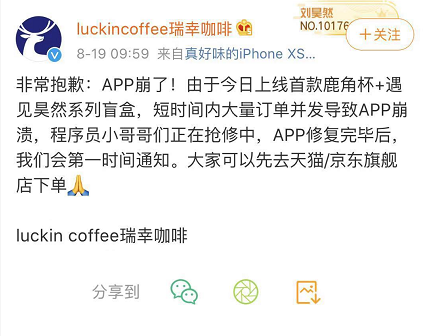 不過,僅在上線不到一小時時間內,已有多名用戶反饋在打開瑞幸APP時出現多次宕機。對此,瑞幸咖啡官方回應表示,由于今日上線首款鹿角杯+遇見昊然系列盲盒,短時間內大量訂單并發導致APP崩潰。目前,程序員正在搶修中,修復完畢后會第一時間告知,并建議用戶可移步天貓/京東旗艦店下單。